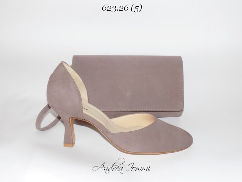 scarpe in camoscio tortora con pochette (bustina) coordinata
