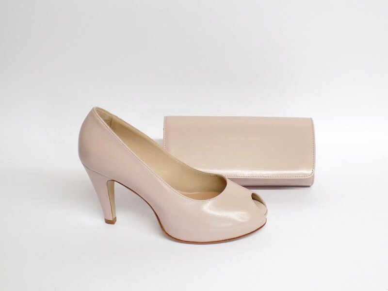 scarpe open toe tacco 8 e pochette in nappa color carne