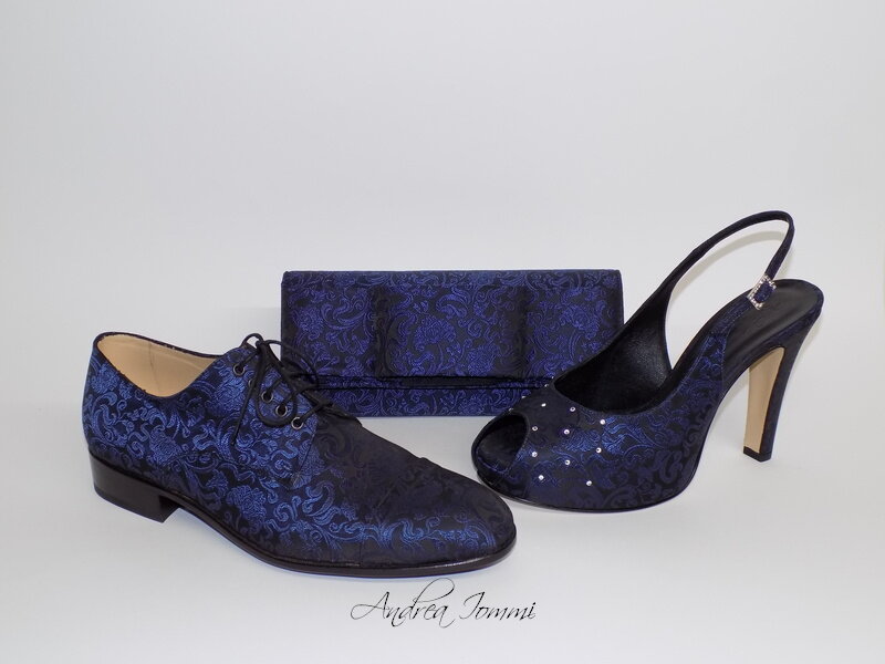 scarpe uomo, donna e borsa con tessuto damascato blu